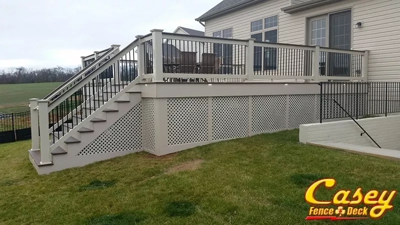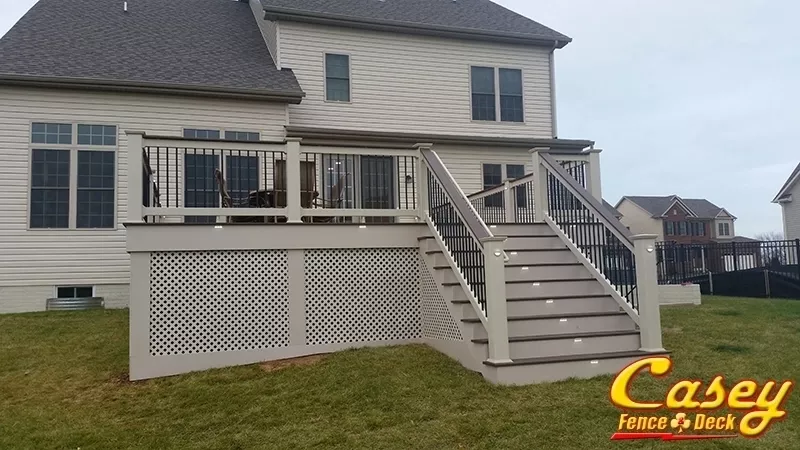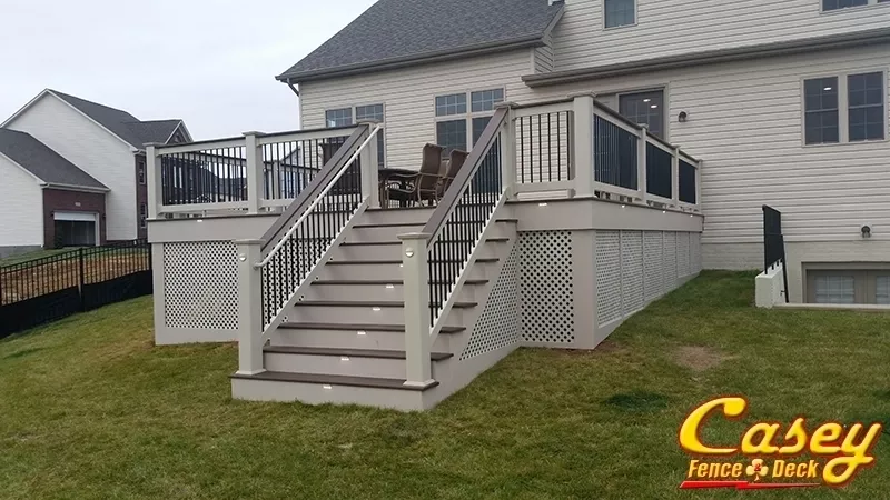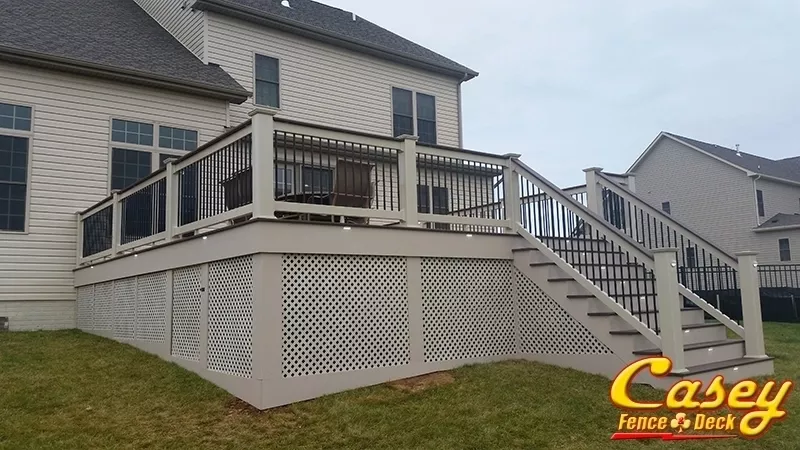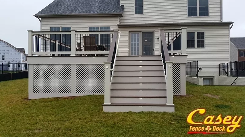 We built this 500 square foot mid level Fiberon Ipe composite deck with Chestnut border, stair treads and rail caps In the new Landsdowne development of Monrovia MD. Deck features custom rails using Tan 6x6 post sleeves, Tan Monument Vinyl Lincoln rail with black round balusters and a deck board rail cap. We also installed tan fascia, stair trim and lattice. There is an LED light on all post sleeves (except corners), and for an extra bit of classic detail, one between each post on the outside of the deck.