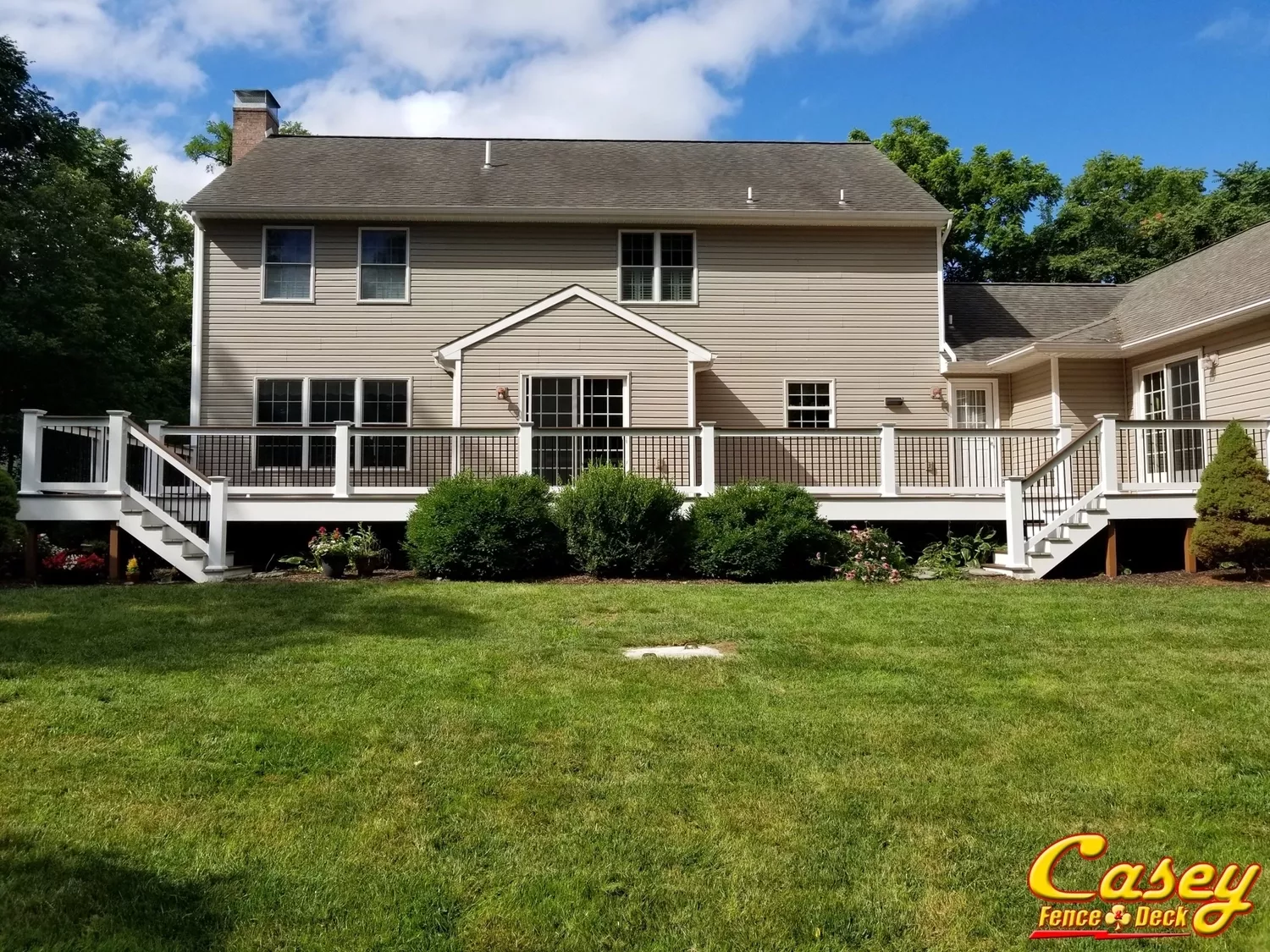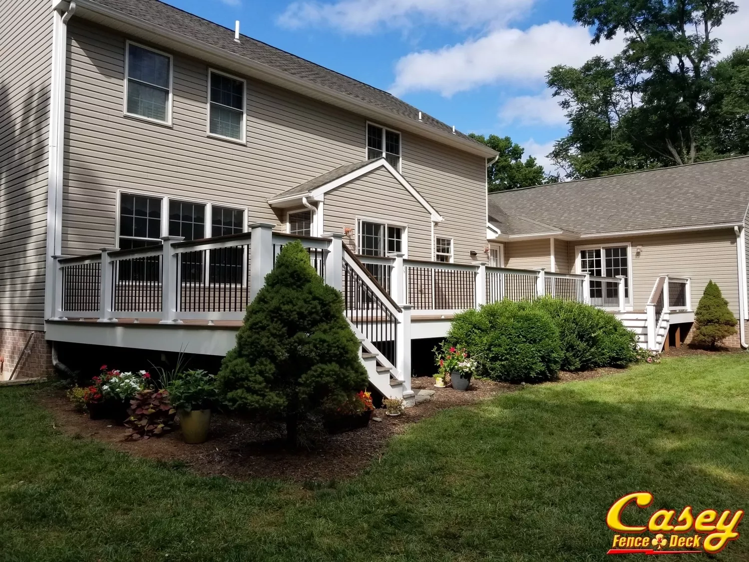 We finished the deck with 6X6 white rail posts, white vinyl rails with black round balusters, Chestnut deck board rail caps, and wrapped the old deck frame with white PVC fascia. - Hagerstown, MD