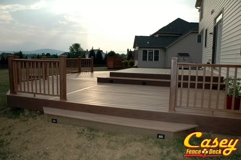 Around 900 square foot composite deck with multiple board patterns and built in lighting on a nice comfortable evening as the sun is setting over Middletown, MD.