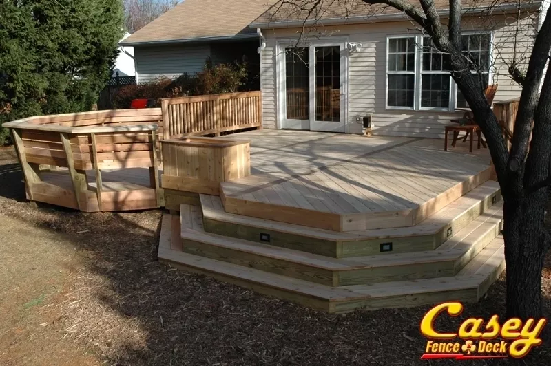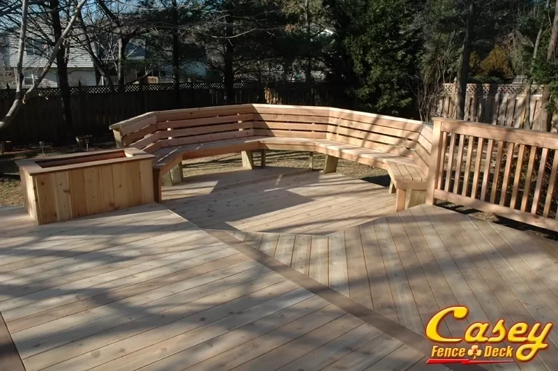 500 square foot Ground level Western Red Cedar deck in Gaithersburg Maryland shows off numerous special features the we love to incorporate into a project. We have our Casey Fence And Deck signature Thunderbird Board pattern with Brazilian Walnut (IPE) inlays and rail cap. We designed this project with a lowered Octagon that features a built in angled back cedar bench. We also crafted a built in cedar planter box. To cap off the project we installed low voltage lighting in the step down to the Octagon and the stairs to the back yard. - Gaithersburg, MD.