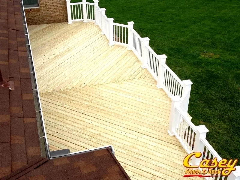 This beautiful treated wood deck in Brunswick MD features a Herring Bone Basket Weave board Pattern and Timbertech white Radiance rail on larger 6x6 white vinyl post sleeves.