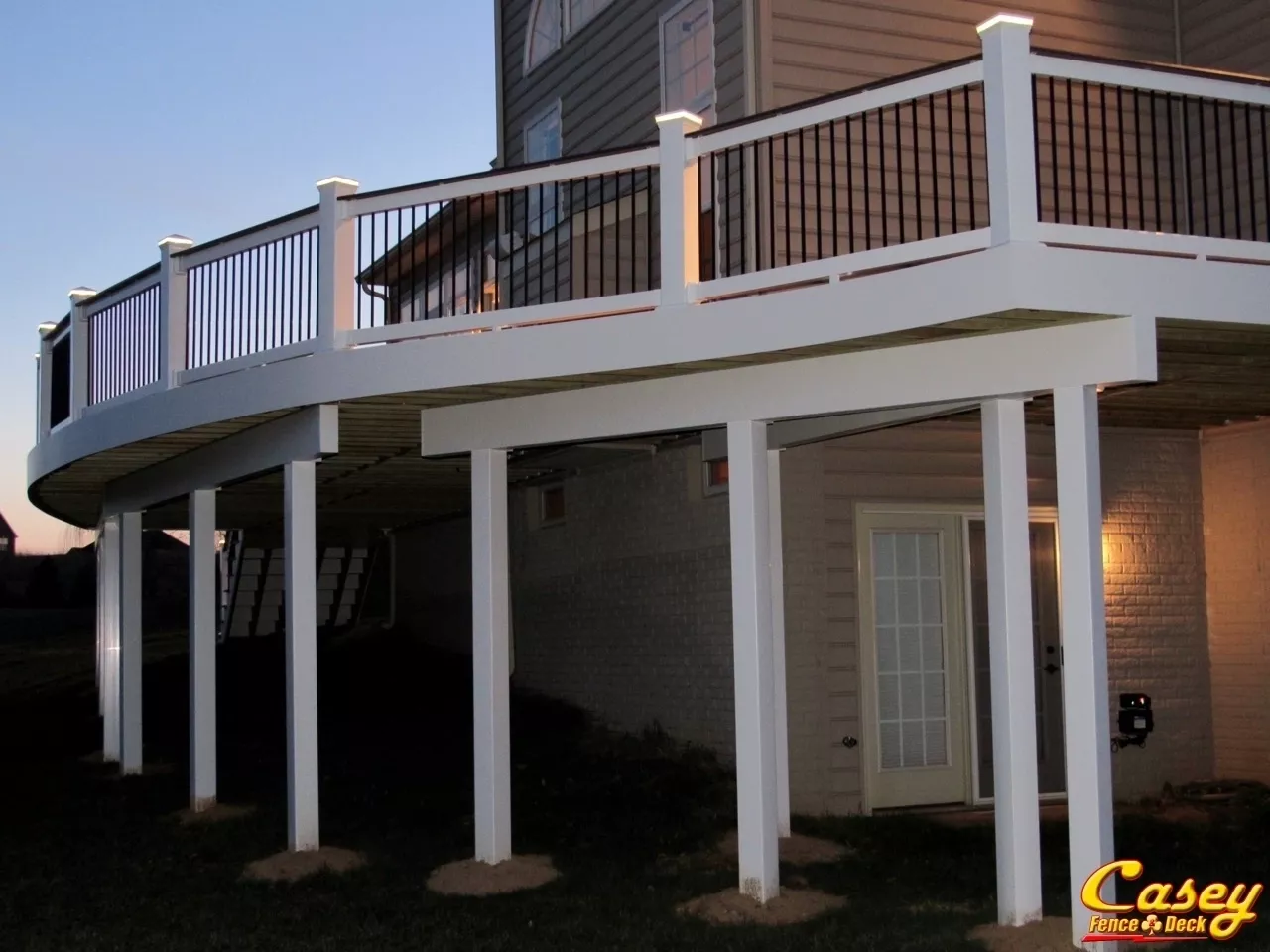 This awesome 700 square foot circular deck was one of our finest projects of 2016. The rounded front extends 37 feet in one direction and then reverses back the other way for the last 13 feet. Rob did a great job laying out this pattern. We used Fiberon Ipe composite decking with Fiberon Chestnut for the inlays, stair treads and rail caps. We wrapped the entire post and beam structure with white PVC. We used steel surface mount rail posts (far exceeds county building codes), wrapped them with over sized white vinyl 6x6 post sleeves. We used Monument Vinyl White rails with black round aluminum balusters. There are 15 6x6 Low Voltage LED post cap lights, an equal number of flush mount lights in the deck, lights in the stairs.