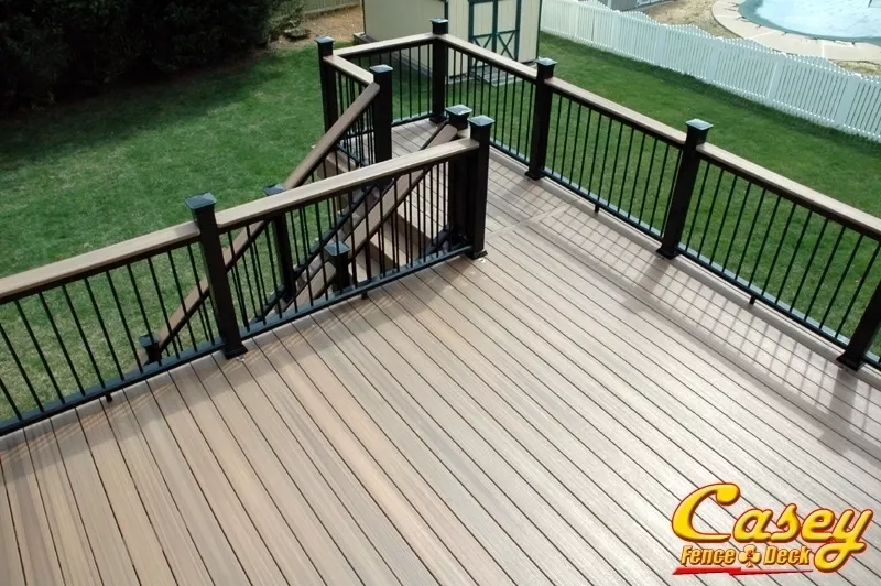 This project was built using Fiberon Paramount PVC Brownstone decking, Fiberon Horizon Black Mission Railing with matching deck boards for the rail cap. We installed 14 bullet lights in the deck and 14 more riser lights on the steps. Matching Brownstone Fascia, Stair risers and stair frame wrap. The lights are from ilighting