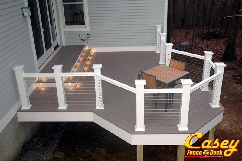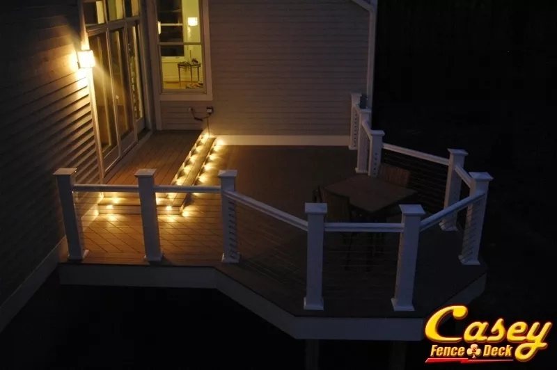 We created this unique deck in Monrovia, MD. with several objectives. The main goal was to not obstruct the view of this wooded lot and the wildlife. We started by lowering the deck 3 steps below the door and then used stainless steel cable for the railing. The deck was constructed with Azek Silver Oak P.V.C. decking laid on an angle with a matching picture frame border. We installed low voltage L.E.D. lights provided by i-Lighting in the stair risers, illuminating the step down without attracting pesky bugs.