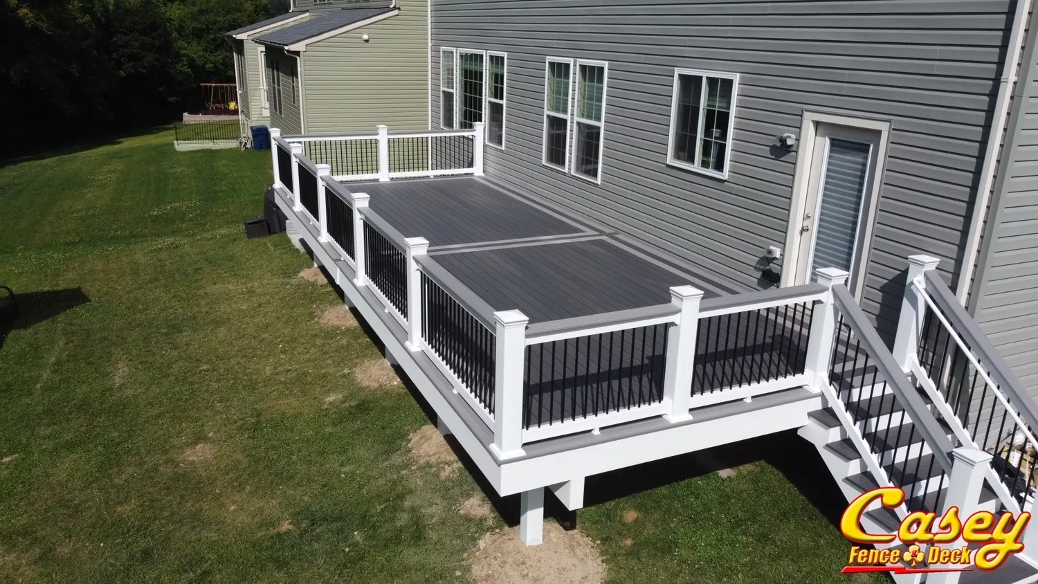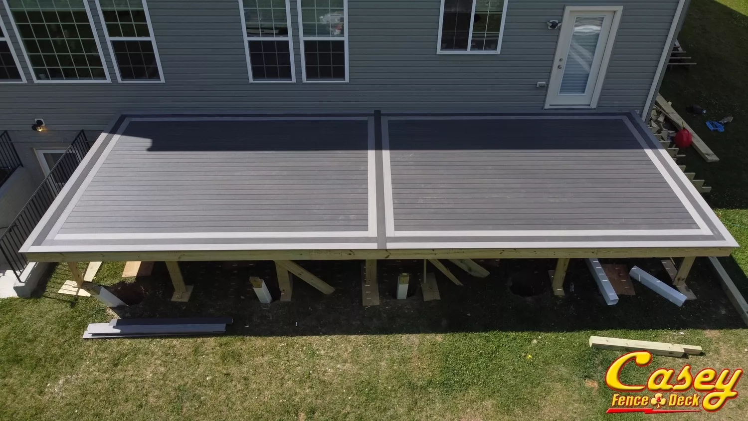 This 500+ square foot Fiberon Composite Earl Gray Deck with triple picture border using Fiberon Chai was built in the Tallyn Ridge development of Frederick, MD. Deck features steel surface mount rail posts, camo edge clips hidden fasteners, Fastenmaster Ledger locks, Monument vinyl white Lincoln Rail with black round aluminum balusters and aluminum reinforcement. Matching full width cocktail rails and 6x6 vinyl rail post sleeves.